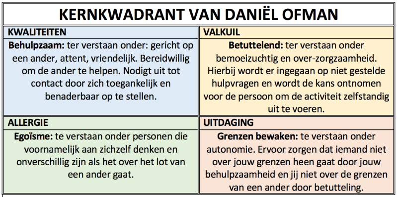 Om mijn kwaliteiten en tekorten te analyseren heb ik gekozen om te werken met het analyse systeem van Daniël Ofman. In dit analysemodel, genaamd het kernkwadrant, komt naar voren wat jouw positieve eigenschap is en hoe jouw positieve eigenschap tegelijkertijd een zwakte kan zijn. Bij deze kwaliteit, hoort dus een valkuil. Om aan deze valkuil te werken hebben wij een uitdaging. Daarnaast is er bij elke kwaliteit een allergie, dit is een tegenhanger van jouw kwaliteit Ik vind het belangrijk dat wij de positieve krachten van onszelf kunnen zien, maar niet alleen van onszelf maar ook van onze collega of zorgvrager. Door op de hoogte te zijn van elkaars kwaliteiten en rekening te houden met elkaars valkuilen, kunnen wij samen werken aan een goede samenwerking en kunnen wij ervoor zorgen dat wij kwalitatief goede zorg kunnen leveren aan onze zorgvragers.